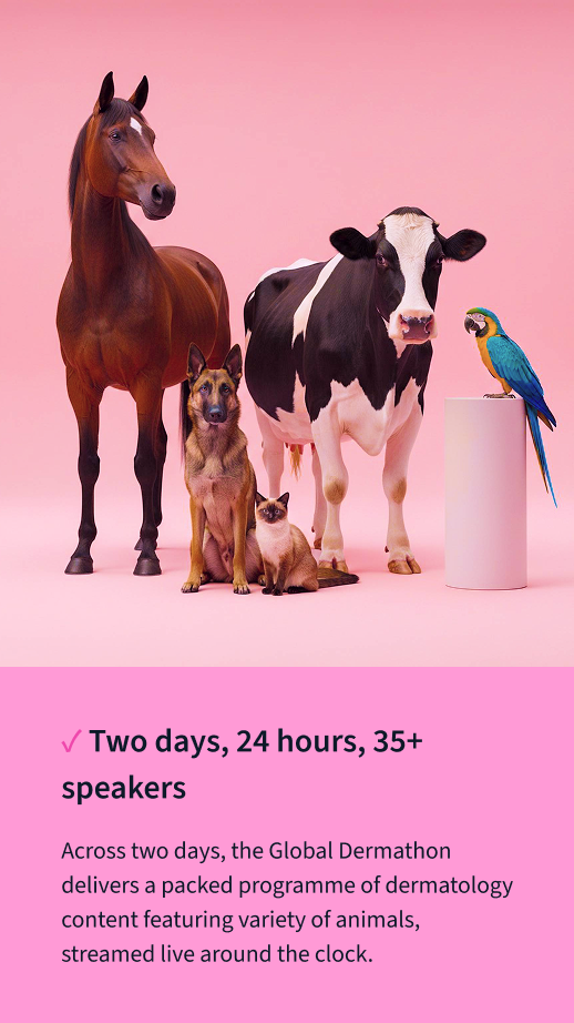 The Global Dermathon will cover major veterinary dermatology topics - from diagnostic skills, to treatment updates and everything in-between. Our experts will be covering dogs, cats, rabbits, birds, horses and cattle, as well as tackling big topics in our panel discussions and back-to-back format.